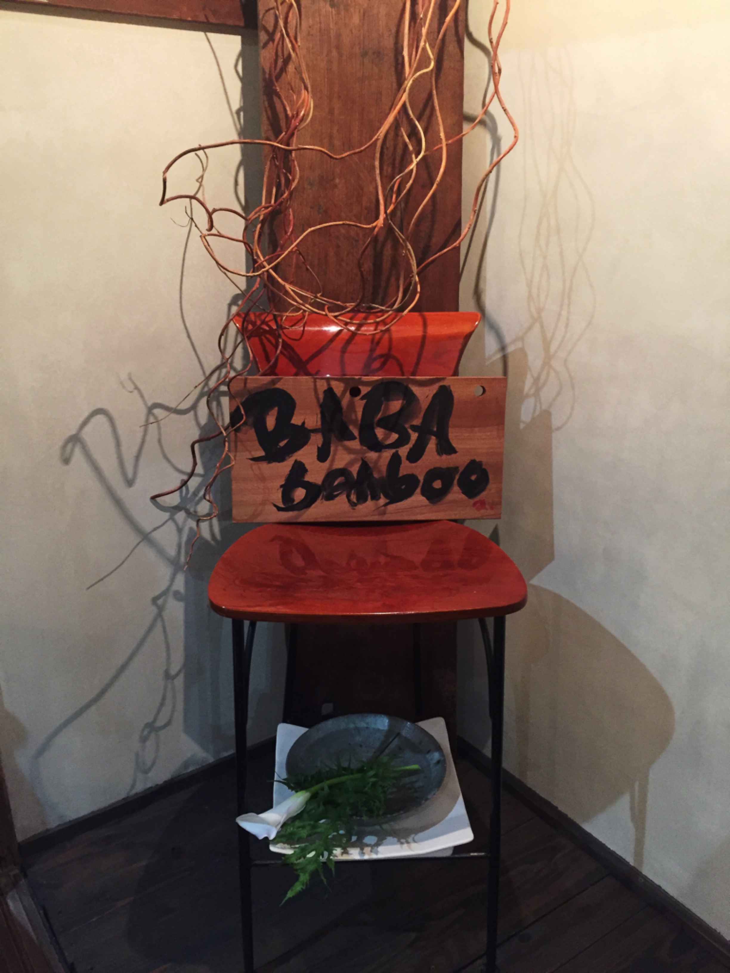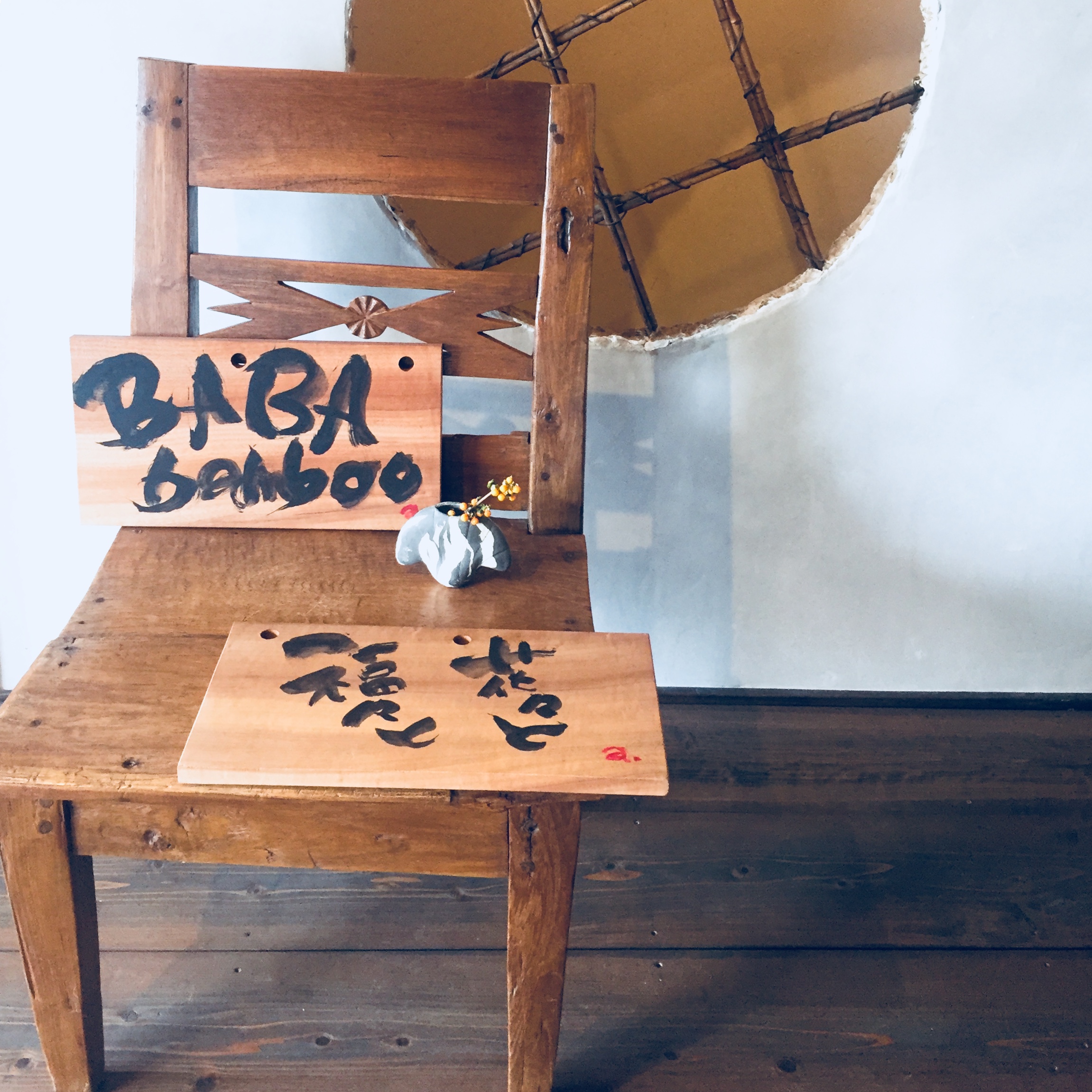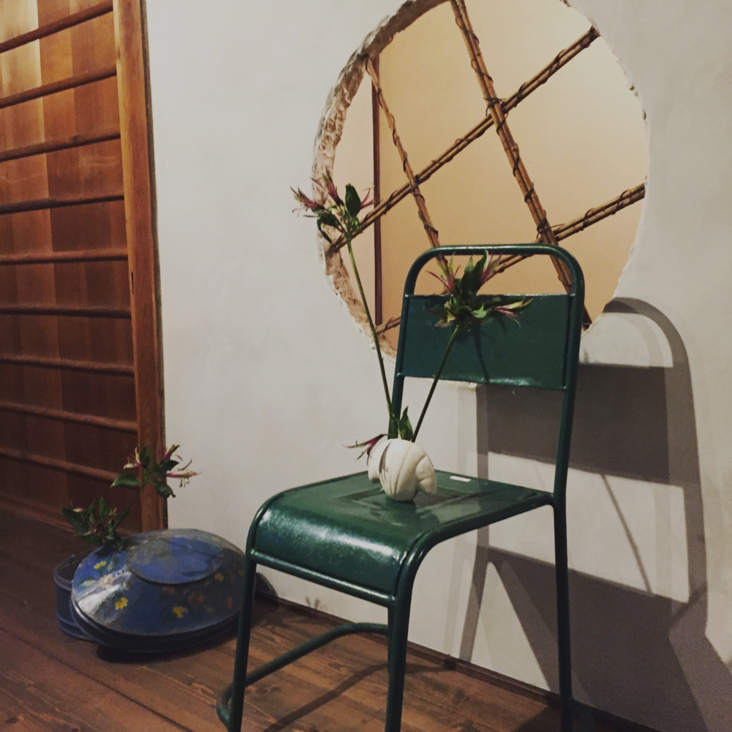 Baliの椅子の上にある花器 貝の形 Baliで使われてた缶にもお花を入れて