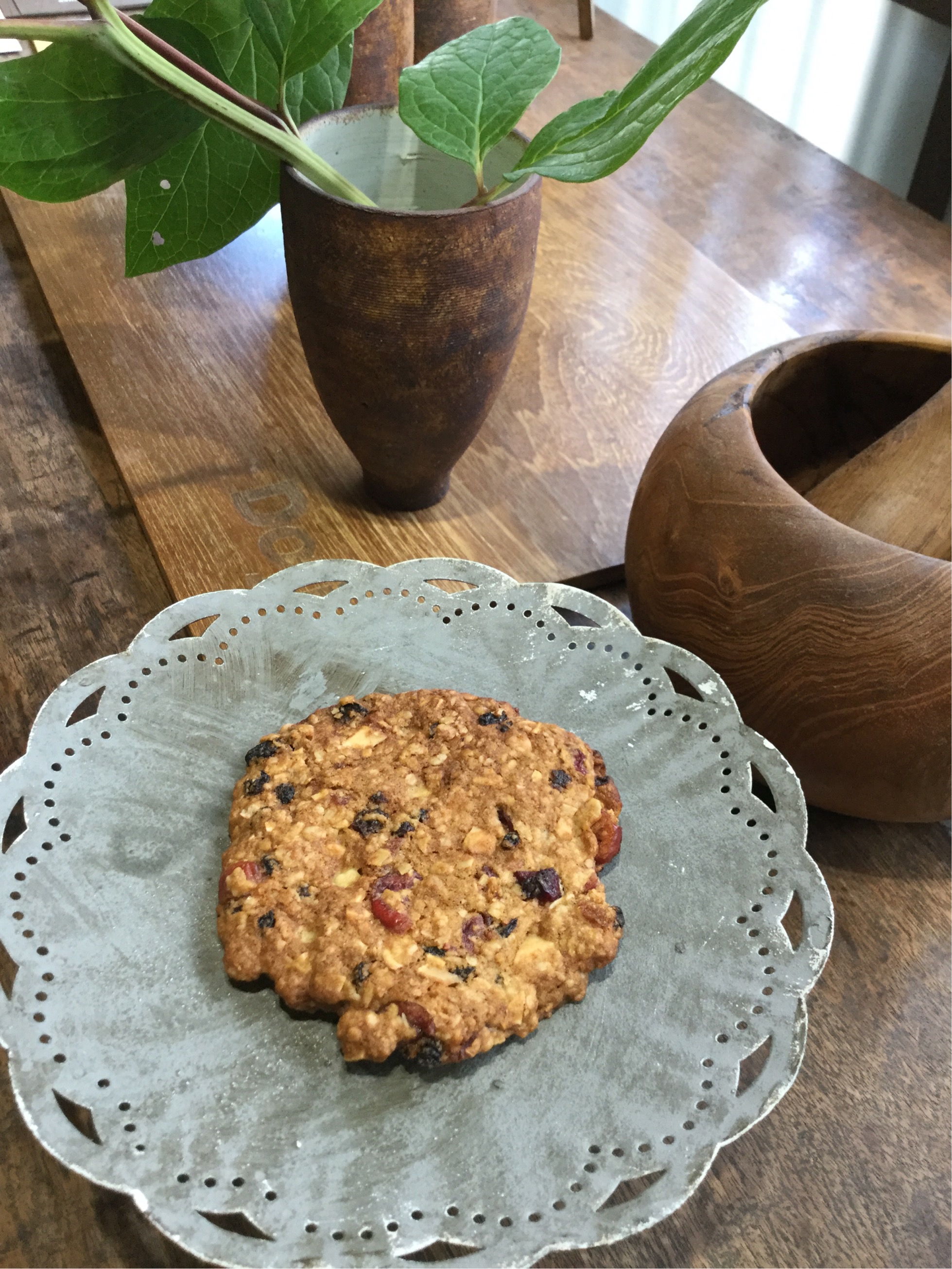 グラノーラクッキー...アメリカ人の先生に教わったレシピをアレンジして作りました。ホワイトチョコレート、クランベリー、カレンズ、アーモンド、カシューナッツ、オーツ麦が入っています。